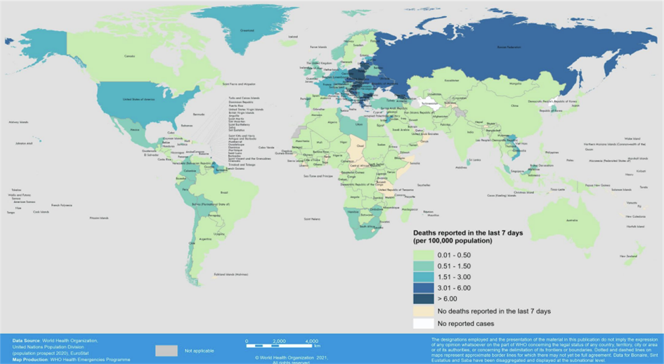 Şekil 3. Ülkelere ve bölgelere göre, son yedi günde 100.000 nüfus başına bildirilen COVID-19 ölüm vakaları, 20-26 Aralık 2021 **