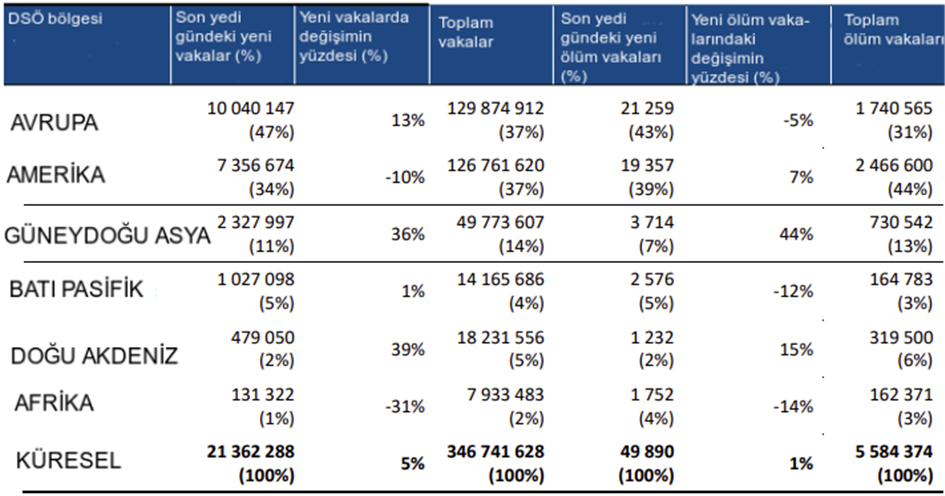 Altı DSÖ bölgesinde, pandeminin başlangıcından bu yana kaydedilen en yüksek haftalık vaka sayısını temsil eden 21 milyondan fazla yeni vaka bildirilmiştir. Ayrıca yaklaşık 50.000 yeni ölüm vakası bildirilmiştir