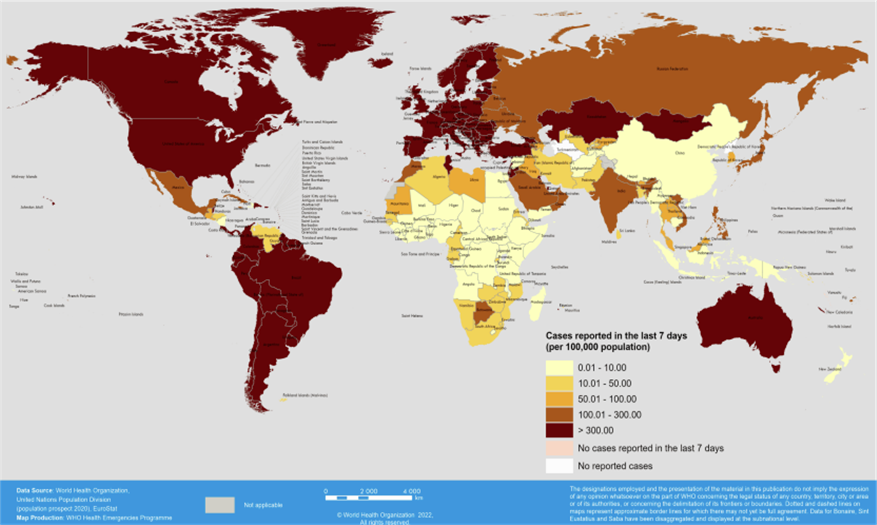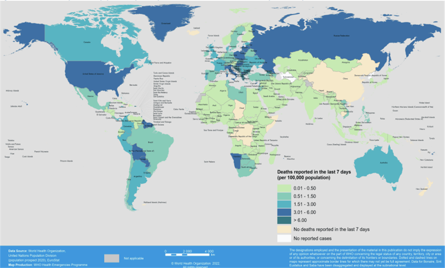 Küresel düzeyde vaka insidansında daha yavaş bir artış gözlemlenmiş ve bölgelerin sadece yarısı, bir önceki hafta altı bölgeden beşine kıyasla yeni haftalık vaka sayısında artış bildirmiştir. Doğu Akdeniz Bölgesi yeni vaka sayısında en büyük artışı rapor etmiş olup (%39), onu Güney Doğu Asya Bölgesi (%36) ve Avrupa Bölgesi (%13) izlemiştir. Afrika Bölgesi yeni vaka sayısında en büyük düşüşü bildirirken (%31), onu Amerika Bölgesi (%10) takip etmiş olup Batı Pasifik Bölgesi'ndeki yeni vaka sayısı bir önceki hafta bildirilene benzer şekilde gerçekleşmiştir. Güneydoğu Asya Bölgesi'nde (%44), Doğu Akdeniz Bölgesi'nde (%15) ve Amerika Bölgesi'nde (%7) haftalık yeni ölüm vaka sayısı artarken, diğer Bölgelerin tümünde yeni haftalık ölümlerde düşüş rapor edilmiştir.