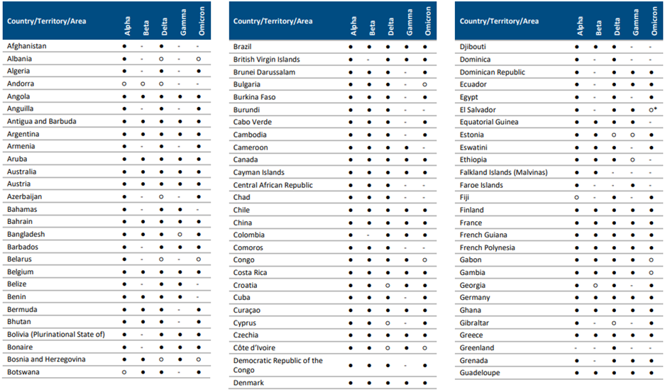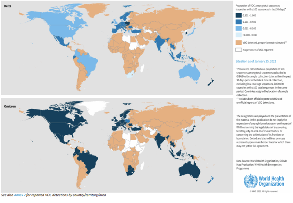 SARS CoV-2'nin mevcut küresel epidemiyolojisi, küresel ölçekte Omicron varyantının baskınlığı, Delta varyantının prevalansında devam eden düşüş ve Alfa, Beta ve Gama varyantlarının çok düşük düzeyde dolaşımı ile karakterize edilir. Omicron varyantı, Pango soyları B.1.1.529, BA.1, BA.2 ve BA.3'ü içerir. Bazı ülkeler BA.2 dizilerinin oranında son zamanlarda artışlar bildirmiş olsa da, 25 Ocak 2022 itibariyle GISAID'e sunulan dizilerin %98,8'ini BA.1 oluşturmaktadır. Tüm bu varyantlar DSÖ tarafından 'Omicron' çatısı altında izlenmektedir. Omicron varyantının seyahatle ilgili vakalarının tanımlanmasının ardından, birçok ülke şimdi topluluk bulaşmasını bildirmektedir. Kasım ve Aralık 2021'de Omicron vakalarında hızlı bir artış yaşayan ülkeler, vakalarda düşüş yaşamış veya yaşamaktadır. Son 30 gün içinde toplanan örneklerle GISAID'e yüklenen 372 680 diziden (i), 332 155'i (%89,1) Omicron, 39 804 (%10,7) Delta, 28'i (<0,1%) Gamma, dördü (< %0.1) Alfa olup ikisi (<%0.1) dolaşımdaki diğer varyantlardan (VOIs Mu ve Lambda) oluşmuştur. Unutulmamalıdır ki, küresel VOC dağılımı, ülkeler arasındaki sıralama kapasiteleri ve örnekleme stratejilerindeki farklılıklar ve ayrıca raporlamadaki gecikmeler de dahil olmak üzere gözetim sınırlamaları dikkate alınarak yorumlanmalıdır.