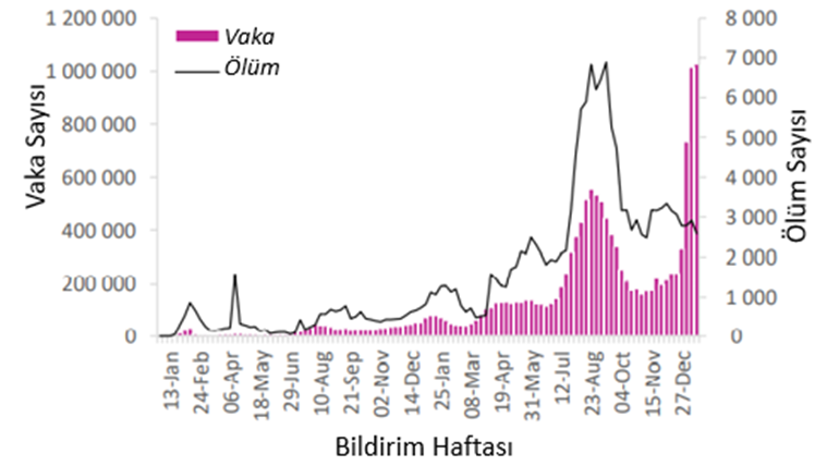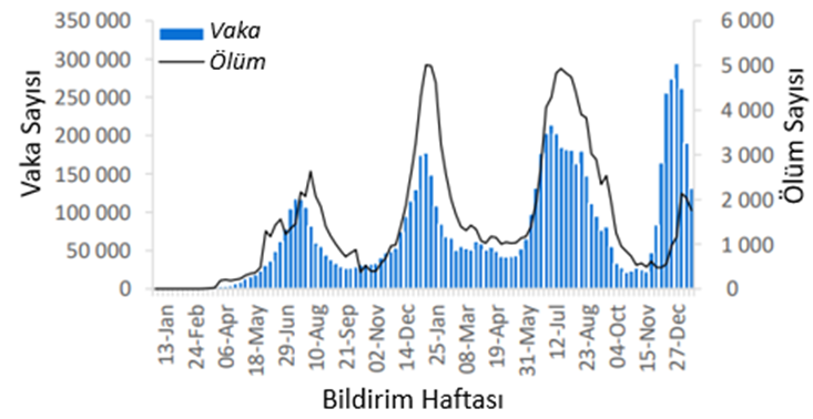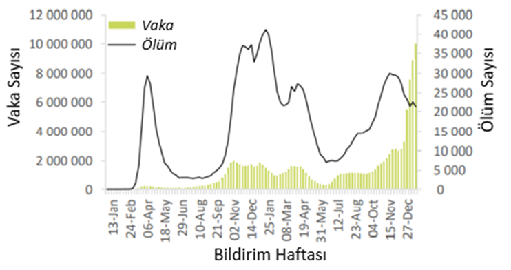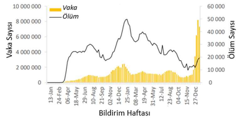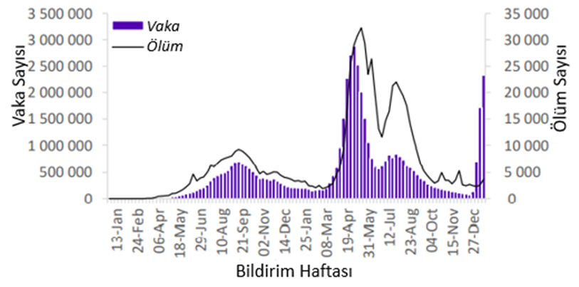 Küresel olarak, yeni COVID-19 vakalarının sayısı geçtiğimiz hafta (17-23 Ocak 2022) %5 artarken, yeni ölüm vakalarıın sayısı önceki hafta bildirilene benzer şekilde gerçekleşmiştir (Şekil 1). Altı DSÖ bölgesinde, pandeminin başlangıcından bu yana kaydedilen en yüksek haftalık vaka sayısını temsil eden 21 milyondan fazla yeni vaka bildirilmiştir. Ayrıca yaklaşık 50.000 yeni ölüm vakası bildirilmiştir. 23 Ocak 2022 tarihi itibariyle, toplamda 346 milyondan fazla teyit edilmiş vaka ve 5.5 milyondan fazla ölüm vakası rapor edilmiştir.