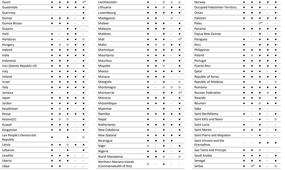Ülkeler ve bölgeler, DSÖ yönetim bölgesi altında düzenlenmiştir. Belirli şirketlerin veya üreticilerin ürünlerinden bahsedilmesi, DSÖ tarafından onaylandığını veya söz konusu benzer nitelikteki diğer ürünlerin yerine önerildiğini ima etmemektedir. Hatalar ve eksiklikler hariç olmak üzere, tescilli ürünlerin isimleri, baş harfleri büyük olacak şekilde ayırt edilmektedir.