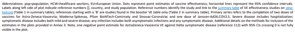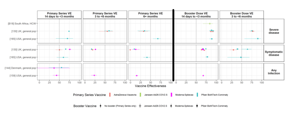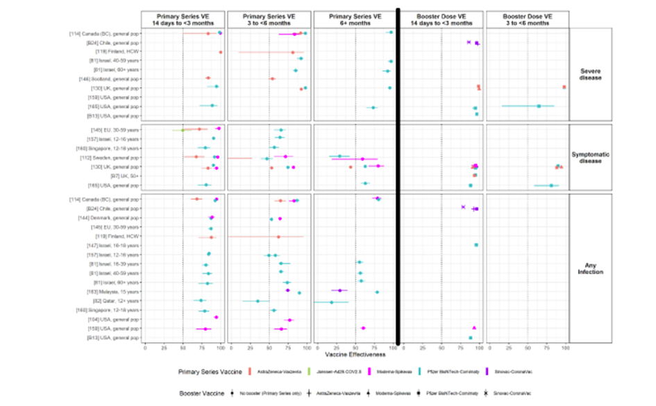 • Şekiller, VE'yi Omicron varyantına karşı değerlendiren Danimarka, Güney Afrika, Birleşik Krallık ve Amerika Birleşik Devletleri'nde yapılan beş çalışmayı ve VE'yi Delta varyantına karşı değerlendiren Avrupa Bölgesi ve Amerika Bölgesi'ndeki çeşitli ülkelerin yanı sıra Katar, Malezya ve Singapur'dan 19 çalışmayı içermektedir.