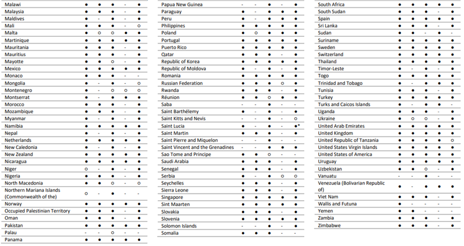 Ülkeler ve bölgeler, DSÖ yönetim bölgesi altında düzenlenmiştir. Belirli şirketlerin veya üreticilerin ürünlerinden bahsedilmesi, DSÖ tarafından onaylandığını veya söz konusu benzer nitelikteki diğer ürünlerin yerine önerildiğini ima etmemektedir. Hatalar ve eksiklikler hariç olmak üzere, tescilli ürünlerin isimleri, baş harfleri büyük olacak şekilde ayırt edilmektedir.
