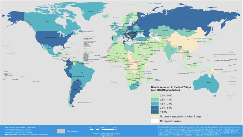 Şekil 3. Ülkelere ve bölgelere göre, son yedi günde 100.000 nüfus başına bildirilen COVID-19 ölüm vakaları, 31 Ocak-6 Şubat 2022 **