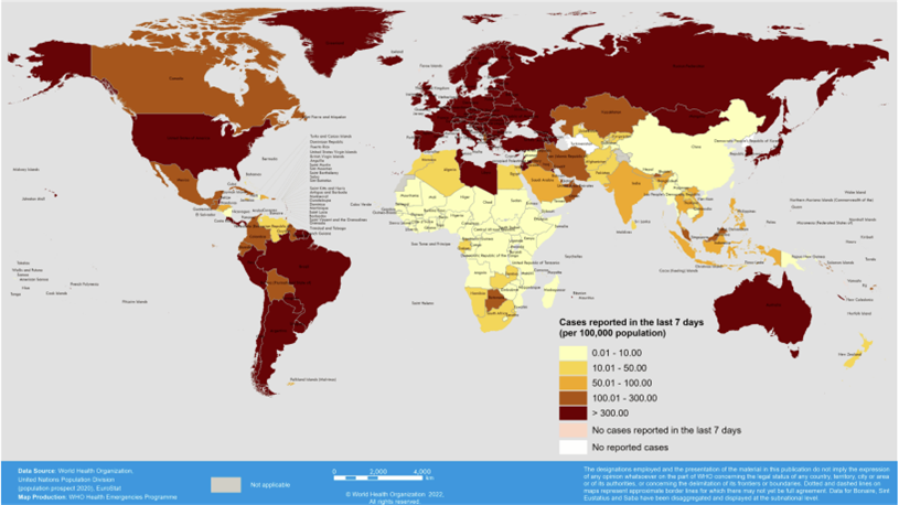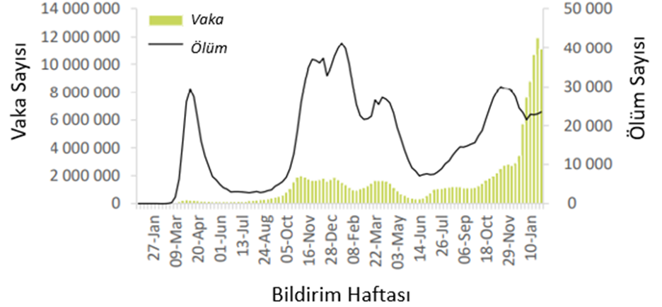 Küresel olarak, 31 Ocak - 6 Şubat 2022 tarihleri arasında, haftalık yeni COVID-19 vakalarının sayısı bir önceki hafta bildirilen sayıya göre %17 azalırken, yeni ölüm vakalarının sayısı %7 artmıştır.