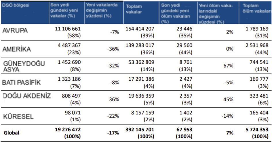 Küresel olarak, 31 Ocak - 6 Şubat 2022 tarihleri arasında, haftalık yeni COVID-19 vakalarının sayısı bir önceki hafta bildirilen sayıya göre %17 azalırken, yeni ölüm vakalarının sayısı %7 artmıştır (şekil 1) . Altı DSÖ bölgesinde 19 milyondan fazla yeni vaka ve 68.000'den az yeni ölüm vakası rapor edilmiştir (tablo 1). 6 Şubat 2022 itibariyle, dünya çapında 392 milyondan fazla doğrulanmış vaka ve 5,7 milyondan fazla ölüm vakası rapor edilmiştir.