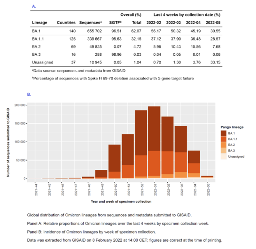 Şekil 4, çizim B, Aralık 2021'de GISAID'e sunulan Omicron soylarının dizilerinin sayısındaki bir artışı ve Ocak 2022'nin başından beri bir azalmayı göstermektedir.Bu küresel eğilim, bazıları yüksek sıralama kapasitesine sahip olanlar dahil olmak üzere birçok ülkede gözlemlenmiştir; dağılımlar diğerlerinde farklı olabilir. Bu eğilimler, ülkeler arasındaki sıralama kapasitesi ve örnekleme stratejilerindeki farklılıklar ve ayrıca sıralama için laboratuvar geri dönüş süreleri ve raporlamadaki gecikmeler dahil olmak üzere sürveyans sistemlerinin sınırlamaları dikkate alınarak yorumlanmalıdır.