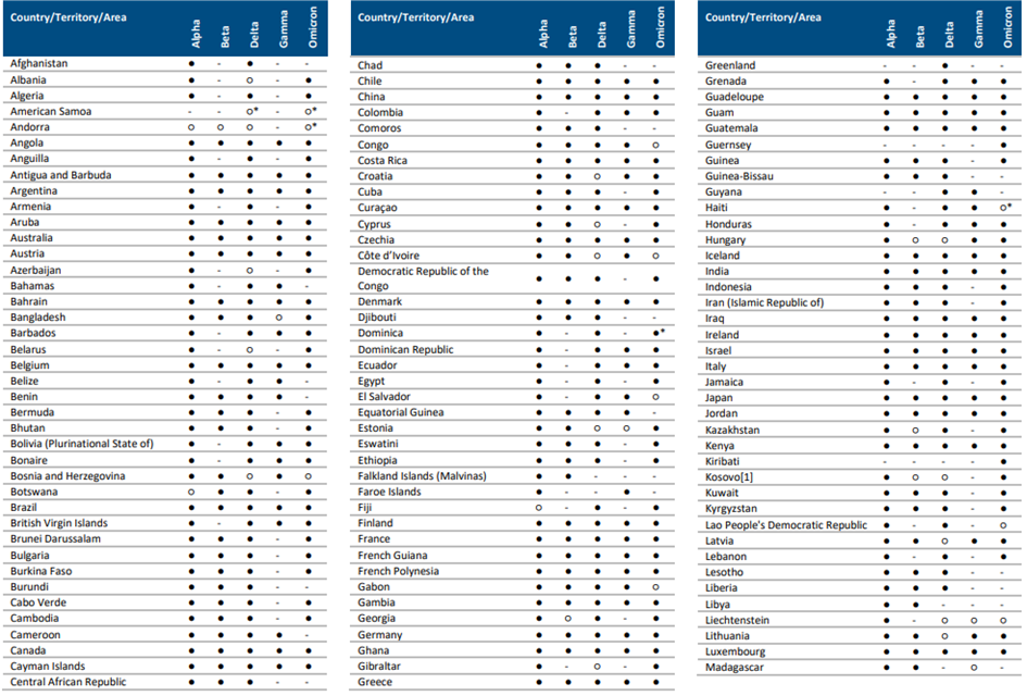** Seyahat edenler (örn. Giriş noktalarında tespit edilen importe vakalar) veya yerel vakalar (toplulukta tespit edilen) arasında VOC tespitini bildiren ülkeleri / bölgeleri / alanları içerir. Endişe verici varyantın tespit edildiğini hiç bildirmemiş ülkeleri, bölgeleri ve alanları hariç tutmaktadır.