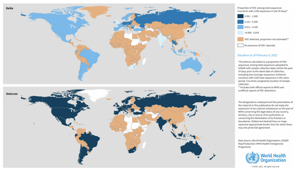 SARS-CoV2'nin mevcut küresel epidemiyolojisi, Omicron varyantının devam eden hızlı küresel yayılımı ile karakterizedir. VOC'ler (Alfa, Beta, Gama ve Delta) ve VOI'ler (Lambda ve Mu) dahil olmak üzere diğer tüm varyantlar, altı DSÖ bölgesinin tümünde azalmaya devam etmektedir. Son 30 gün içinde toplanan örneklerle GISAID'e yüklenen 426.363 diziden(i), 412.265'i (%96.7) Omicron, 13.972'si (%3.3) Delta, ikisi (<%0.1) Gamma ve ikisi de ( <0.1%) Alfa varyantlarından oluşmuştur. VOI'ler Mu ve Lambda dahil olmak üzere başka herhangi bir varyant için rapor edilen hiçbir diziye rastlanılmamıştır. Unutulmamalıdır ki, küresel VOC dağılımı, ülkeler arasındaki sıralama kapasiteleri ve örnekleme stratejilerindeki farklılıklar ve ayrıca raporlamadaki gecikmeler de dahil olmak üzere sürveyans sınırlamaları dikkate alınarak yorumlanmalıdır.