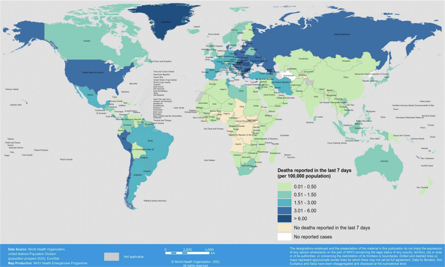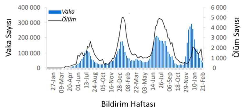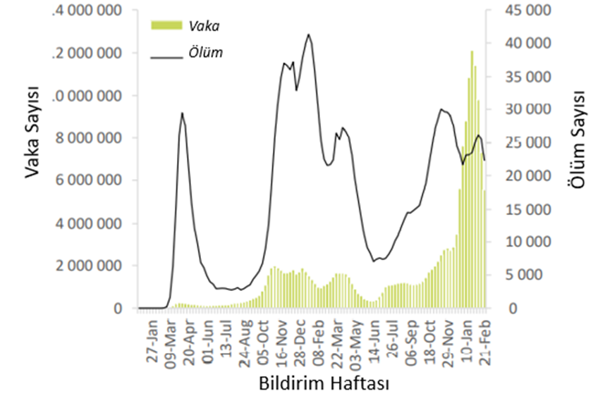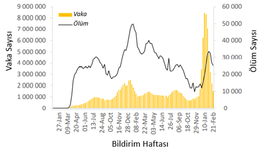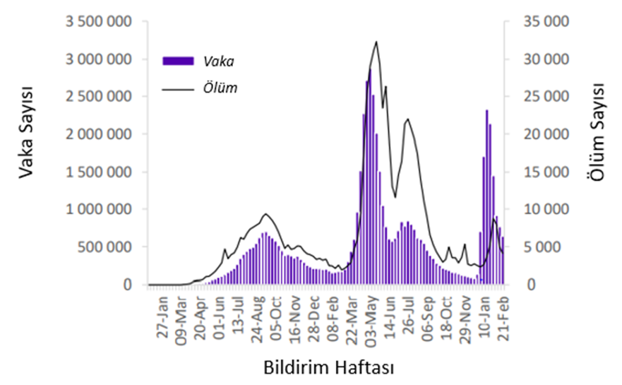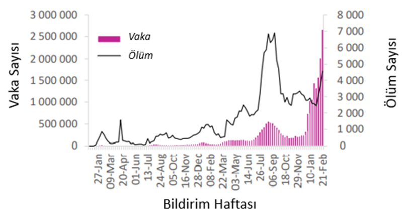 Küresel olarak, 21-27 Şubat 2022 tarihleri arasında haftalık yeni COVID-19 vakalarının ve ölüm vakalarının sayısı bir önceki haftaya göre sırasıyla %16 ve %10 azalmaya devam etmiştir. Altı DSÖ bölgesinde 10 milyondan fazla yeni vaka ve 60.000'den fazla yeni ölüm vakası bildirilmiştir.