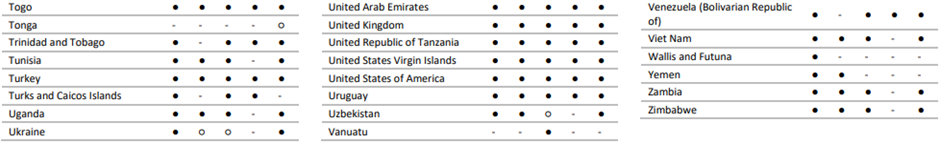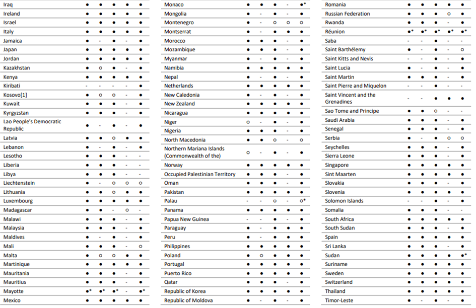 Ülkeler ve bölgeler, DSÖ yönetim bölgesi altında düzenlenmiştir. Belirli şirketlerin veya üreticilerin ürünlerinden bahsedilmesi, DSÖ tarafından onaylandığını veya söz konusu benzer nitelikteki diğer ürünlerin yerine önerildiğini ima etmemektedir. Hatalar ve eksiklikler hariç olmak üzere, tescilli ürünlerin isimleri, baş harfleri büyük olacak şekilde ayırt edilmektedir.