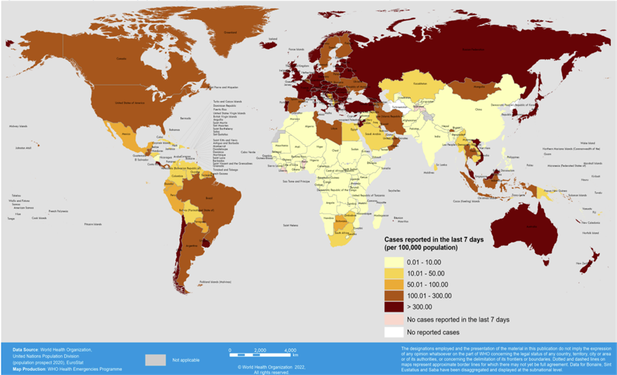 En çok yeni vaka bildiren ülkeler; Almanya (1.119.632 yeni vaka; -%8), Güney Kore (1.032.008 yeni vaka; +%69), Rusya Federasyonu (920.697 yeni vaka; -%26), Türkiye (541.259 yeni vaka) yeni vakalar; -%10) ve Brezilya (519.785 yeni vaka; -%33) olmuştur.
