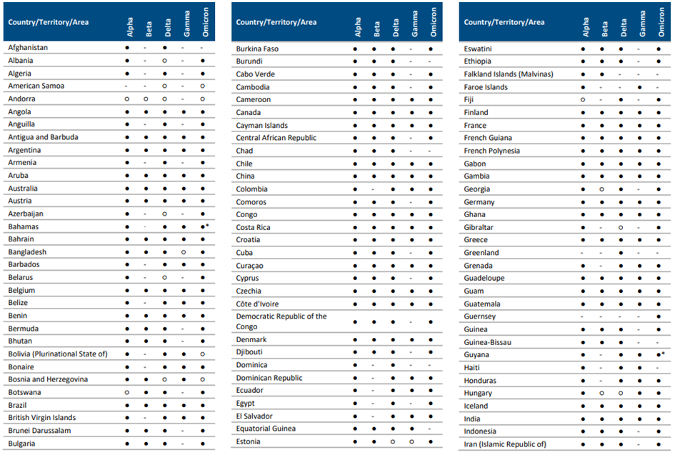 SARS-CoV-2'nin mevcut küresel epidemiyolojisi, Omicron varyantının küresel egemenliği ile karakterize edilir. Delta, bildirilen önemli dolaşıma sahip tek diğer adlandırılmış varyant olmaya devam etmektedir. Son 30 gün içinde toplanan örneklerle GISAID'e yüklenen 495.016 dizinin (i) 490.519’u (%99,1) Omicron, 3.841’i (%0,8) Delta, biri (<0,1%) Alpha ve biri VOI/VOC dizisi dışında kalan bir varyanttan oluşmuştur. Son 30 gün içinde GISAID'e hiçbir Beta, Gama, Lambda veya Mu dizisi bildirilmemiştir. Unutulmamalıdır ki, küresel VOC dağılımı, ülkeler arasındaki sıralama kapasiteleri ve örnekleme stratejilerindeki farklılıklar ve ayrıca raporlamadaki gecikmeler de dahil olmak üzere gözetim sınırlamaları dikkate alınarak yorumlanmalıdır.