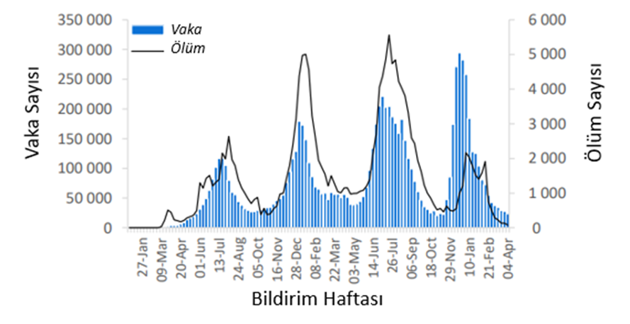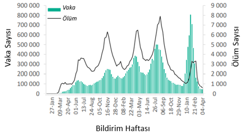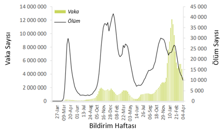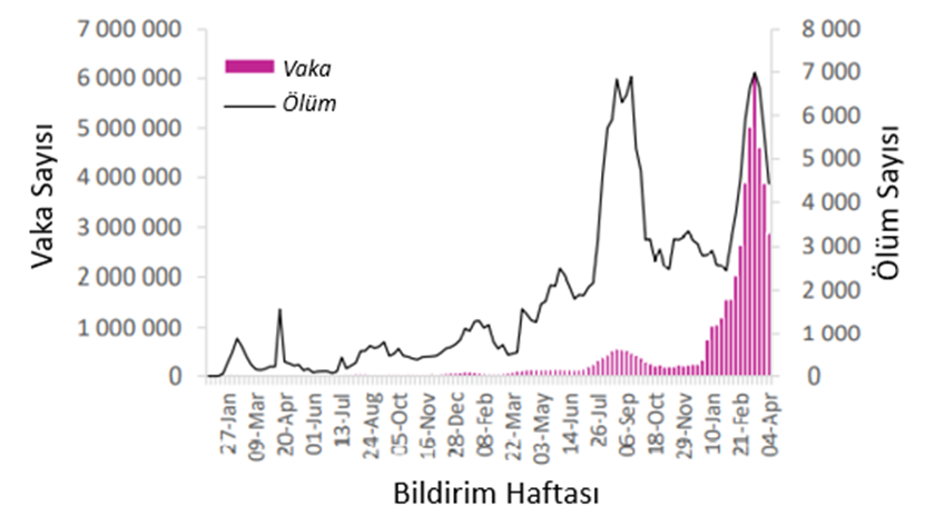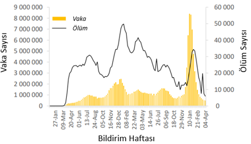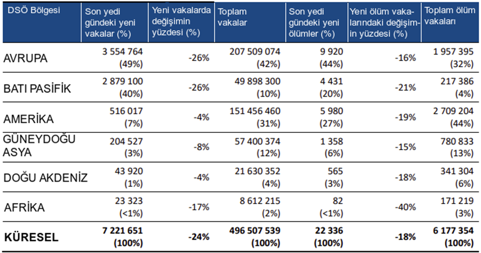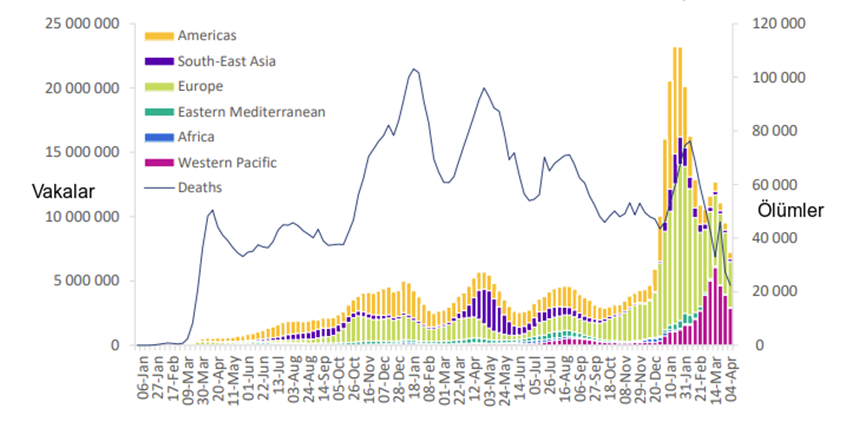 Küresel olarak, 4-10 Nisan 2022 tarihleri arasında haftalık yeni COVID-19 vakaları ve ölüm vakalarının sayısı art arda üçüncü hafta da düşmeye devam etmiş ve 7 milyondan fazla vaka ve 22.000'den fazla ölüm vakası bildirilmiş olup bir önceki haftaya göre sırasıyla %24'lük ve %18’lik bir düşüş gerçekleşmiştir.