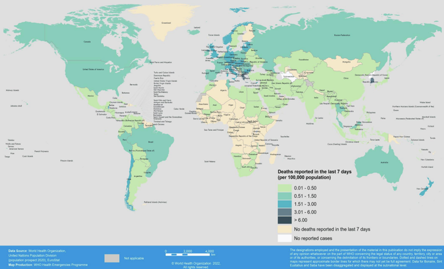 En yüksek haftalık yeni ölüm vakası sayısı ise Amerika Birleşik Devletleri (3.682 yeni ölüm; -%9), Güney Kore (2.186 yeni ölüm; -%6), Rusya Federasyonu (2.008 yeni ölüm; - %15), Almanya (1 686 yeni ölüm; +%6) ve Brezilya’dan (1 120 yeni ölüm; -%22) rapor edilmiştir.
