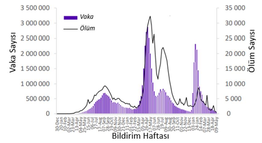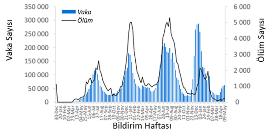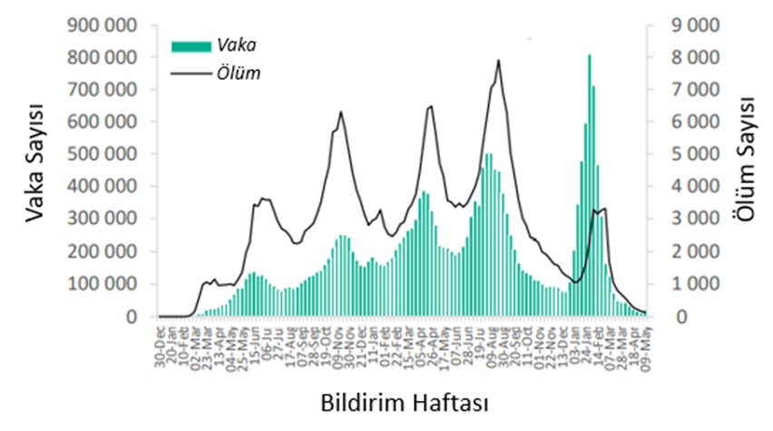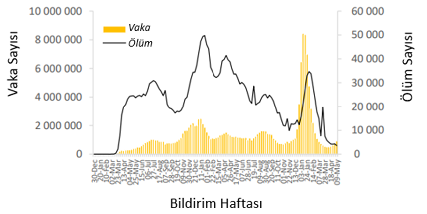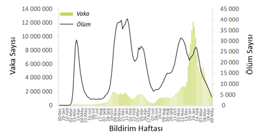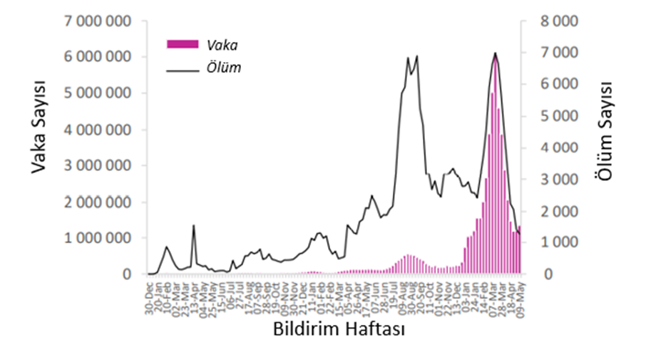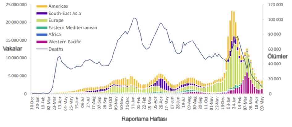 Küresel olarak, Mart 2022'nin sonundan bu yana gözlemlenen devam eden düşüşün ardından, raporlama döneminde (9 Mayıs - 15 Mayıs 2022) yeni haftalık COVID-19 vaka sayıları, önceki haftaya göre bildirilen 3,6 milyondan fazla vaka ve %1'lik bir artış ile stabil hale gelmiştir (şekil 1). Öte yandan, aynı dönemde bildirilen 9000'den fazla ölümle, bir önceki haftaya göre %21'lik bir düşüşü temsil eden yeni haftalık ölüm sayısında düşüş devam etmektedir.