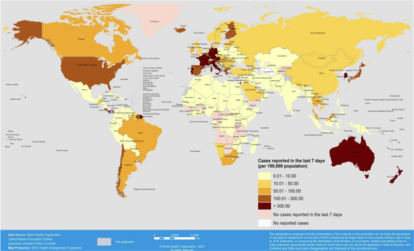 Küresel olarak, Mart 2022'nin sonundan bu yana gözlemlenen devam eden düşüşün ardından, raporlama döneminde (9 Mayıs - 15 Mayıs 2022) yeni haftalık COVID-19 vaka sayıları, önceki haftaya göre bildirilen 3,6 milyondan fazla vaka ve %1'lik bir artış ile stabil hale gelmiştir.