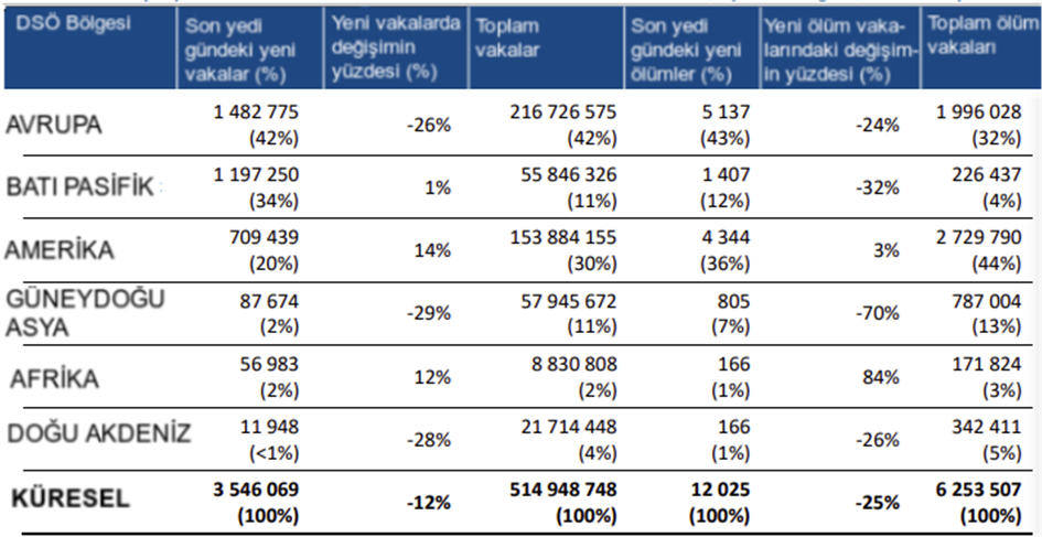 DÜNYA SAĞLIK ÖRGÜTÜ’NÜN 18.05.2022 TARİHLİ YENİ KORONAVİRÜS (COVID-19) HAFTALIK DURUM RAPORU