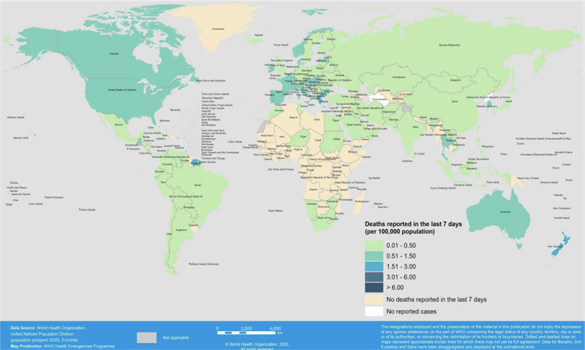 Şekil 3. Ülkelere ve bölgelere göre, son yedi günde 100.000 nüfus başına bildirilen COVID-19 ölüm vakaları, 9-15 Mayıs 2022 *