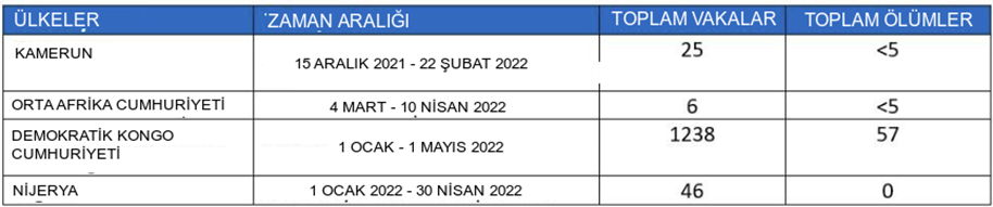 Tablo 2. Endemik ülkelerde 15 Aralık 2021 ile 1 Mayıs 2022 tarihleri arasında maymun çiçeği vakaları