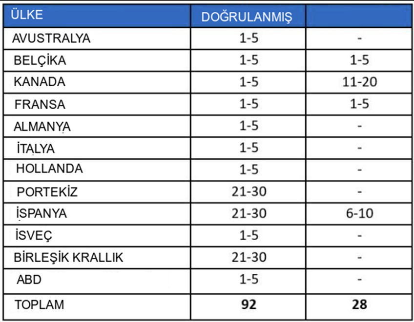 Tablo 1. Endemik olmayan ülkelerde 13-21 Mayıs 2022 tarihleri arasında saat 13:00 itibariyle DSÖ'ye bildirilen maymun çiçeği vakaları