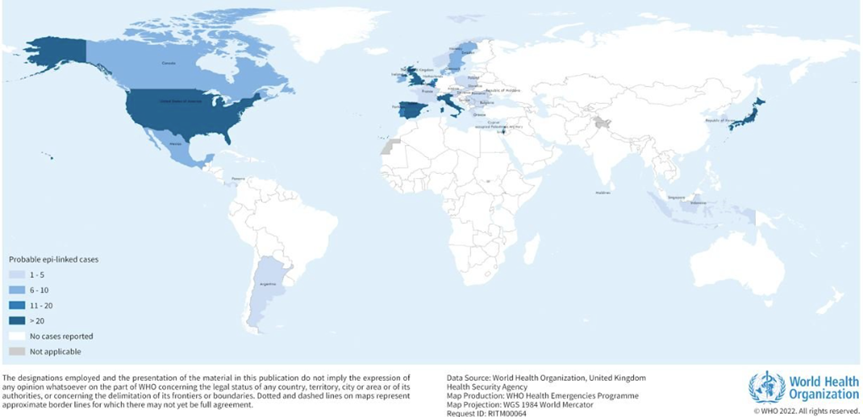 26 Mayıs 2022 itibariyle, beş DSÖ Bölgesindeki 33 ülkeden DSÖ vaka tanımına(1) uyan 650 olası vaka DSÖ'ye rapor edilmiştir ve sınıflandırma bekleyen 99 ek vaka bulunmaktadır. Bildirilen vakaların çoğu (n=374; %58) DSÖ Avrupa Bölgesi'ndendir (22 ülke), 222 vaka (%34) yalnızca Büyük Britanya Birleşik Krallığı ve Kuzey İrlanda'dan rapor edilmiştir. Amerika Bölgesi (n=240, Amerika Birleşik Devletleri'ndeki 216 vaka dahil), Batı Pasifik Bölgesi (n=34), Güneydoğu Asya Bölgesi (n=14) ve Doğu Akdeniz Bölgesinden de (n=5) (Şekil 1, Tablo 1) olası vakalar ve sınıflandırma bekleyen vakalar bildirilmiştir.