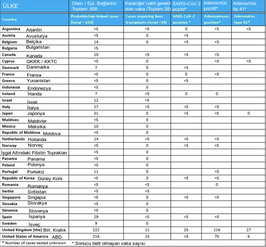 - Esas olarak Avrupa'da yürütülen pediatrik ve karaciğer merkezlerinin ilk araştırması, çocuklarda etiyolojisi bilinmeyen mevcut şiddetli akut hepatit vakalarının sayısının birden fazla ülkede veya yalnızca belirli ülkelerde arka plan oranlarının üzerinde olup olmadığını belirlemek için genişletilmiştir.