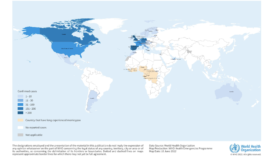 8 Haziran itibariyle, maymun çiçeğinin olağan olmadığı veya daha önce bildirilmediği dört DSÖ Bölgesinde 28 ülkeden 1.285 laboratuvar tarafından doğrulanmış vaka ve bir olası vaka DSÖ'ye bildirilmiştir. Bu, 4 Haziran 2022'de 780 vakanın bildirildiği önceki Hastalık Salgını Haberinden bu yana laboratuvarca doğrulanmış 505 vakadaki artışı temsil etmektedir. 8 Haziran 2022 itibariyle, bu dört Bölgede bağlantılı ölüm bildirilmemiştir.