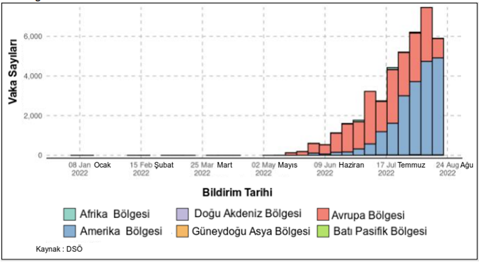 - 15-21 Ağustos tarihleri arasında hafta boyunca, Amerika Bölgesi'nde bildirilen vaka sayısı, son birkaç hafta içinde görülen eğilimleri teyit ederek, devam eden dik bir artış göstermektedir. Küresel olarak, art arda dört haftalık artıştan sonra, rapor edilen maymun çiçeği vakalarının sayısı, aynı hafta içinde (n=5907 vaka) bir önceki haftaya (n=7477 vaka) kıyasla genel olarak %21 azalmıştır. Bu düşüş, Avrupa bölgesinde daha sonra teyit edilmesi gereken azalan vaka sayısının erken belirtilerini yansıtabilir.