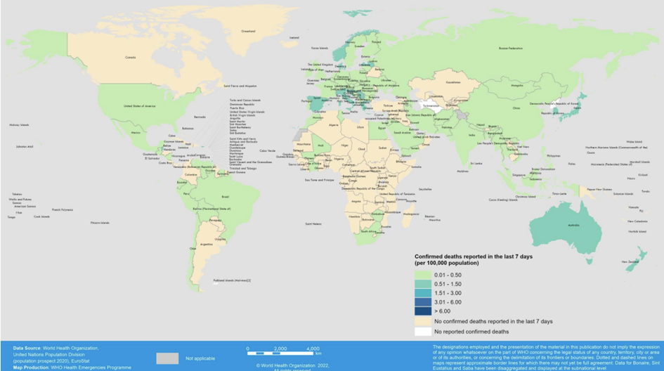 Küresel olarak, 19-25 Eylül 2022 tarihleri arasında bir önceki haftaya göre haftalık yeni vaka sayısı %11 azalmış ve üç milyondan fazla yeni vaka bildirilmiştir. Yeni haftalık ölüm sayısı, bir önceki haftaya göre %18 azalmış olup 8900'den fazla ölüm vakası rapor edilmiştir.