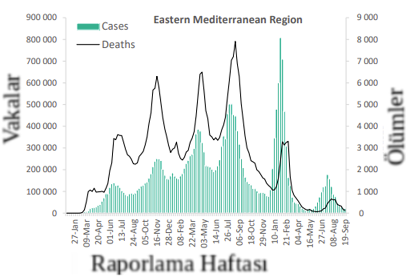 Bölge'de haftalık yeni ölüm vakası sayısı bir önceki haftaya göre %26 azalmış olup 100'ün üzerinde yeni ölüm bildirilmiştir. En çok yeni ölüm vakası rapor eden ülkeler, İran (85 yeni ölüm; 100.000'de <1 yeni ölüm; -%29), Lübnan (13 yeni ölüm; 100.000'de <1 yeni ölüm; +%8) ve Suudi Arabistan (11 yeni ölüm; 100.000'de <1 yeni ölüm; -%27) olmuştur.