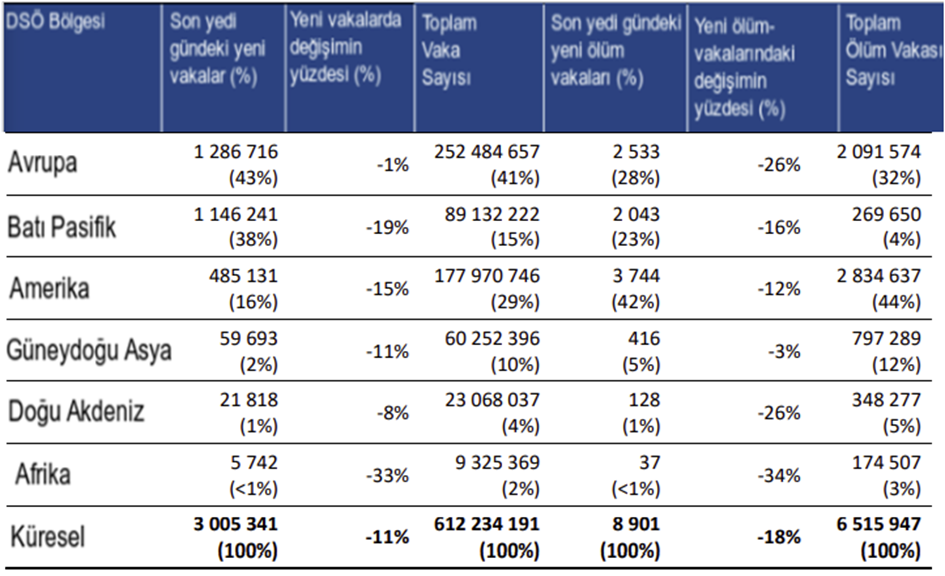 DÜNYA SAĞLIK ÖRGÜTÜ’NÜN 28.09.2022 TARİHLİ YENİ KORONAVİRÜS (COVID-19) HAFTALIK DURUM RAPORU