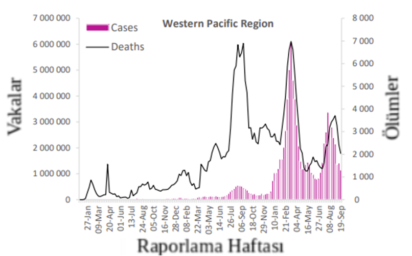 Batı Pasifik Bölgesi, önceki haftaya göre %19 düşüşle 1,1 milyondan fazla yeni vaka bildirmiştir. Beş (%15) ülke yeni vakalarda %20 veya daha fazla artış bildirmiş olup en büyük oransal artışlardan bazıları Yeni Zelanda (12 957'ye 3178 yeni vaka; +%308), Papua Yeni Gine (44 yeni vakaya karşı 25 yeni vaka) ; +76%) ve Filipinler’de (16 357 vs 12 069 yeni vaka; +%36) gözlenmiştir. En çok yeni vaka Japonya (535 502 yeni vaka; 100.000'de 423.4 yeni vaka; -%12), Çin (292 476 yeni vaka; 100.000'de 19.9 yeni vaka; önceki haftaya benzer) ve Güney Kore’den (225 662 yeni vaka; 100.000'de 440,2 yeni vaka; -%42) rapor edilmiştir.