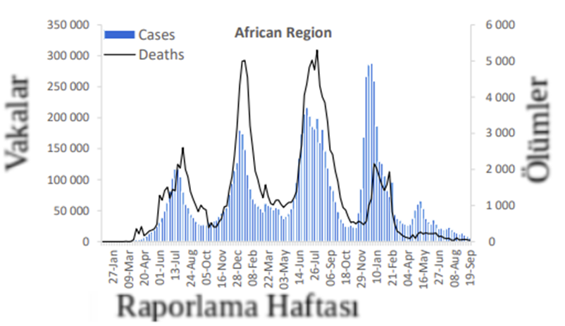 Afrika Bölgesi, bir önceki haftaya göre %33'lük bir düşüşle haftalık 5700'ün üzerinde yeni vaka bildirmiştir. Sekiz (%16) ülke yeni vaka sayısında %20 veya daha fazla artış bildirmiş olup en büyük oransal artışlardan bazıları Zimbabwe (344'e 126 yeni vaka; +%173) Togo (196'ya 128 yeni vaka; +%53) ve Kenya’da (57'ye karşı 42 yeni vaka; +%36) görülmüştür. En çok yeni vaka rapor eden ülkeler Saint Helena (1357 yeni vaka; 100.000 nüfus başına 22 352.2 yeni vaka; +%1867), Reunion (1325 yeni vaka; 100.000 kişide 148,0 yeni vaka; -%48) ve Güney Afrika (1283 yeni vaka; 100.000'de 2,2 yeni vaka; -%20) olmuştur.