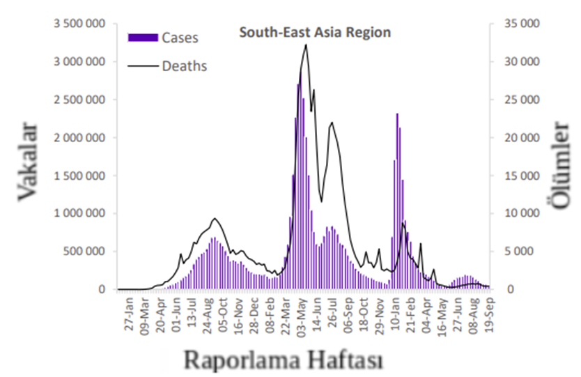 Bölge, önceki haftaya benzer şekilde 400'den fazla ölüm vakası bildirmiştir. En çok yeni ölüm vakası bildiren ülkeler Hindistan (173 yeni ölüm; 100.000'de <1 yeni ölüm; -%7), Endonezya (122 yeni ölüm; 100.000'de <1 yeni ölüm; önceki haftaya benzer) ve Tayland (89 yeni ölüm; 100.000'de <1 yeni ölüm; önceki haftaya benzer) olmuştur.