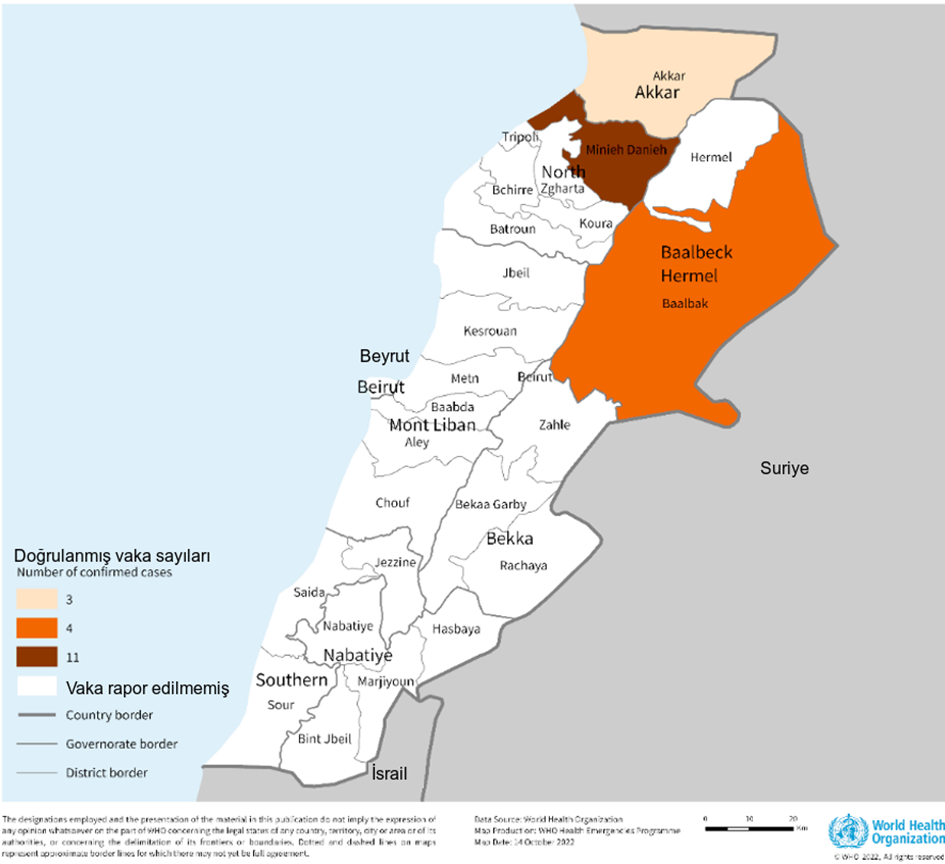 13 Ekim itibariyle, toplam 18 doğrulanmış vaka rapor edilmiştir. En çok etkilenen yaş grubu 5 yaş altı çocuklardır (%44,4; n=8), bunu 45-64 yaş arası (%22,2; n=4), 25-44 yaş (%16,7; n=3) ve 5-15 (%16.7; n=3) yaş arasındaki kişiler izlemektedir. Kadınlar salgından orantısız olarak etkilenmektedir (%72; n=13). Toplam vakaların 11'i (%61,1) Minieh - Danniyeh ilçesinden, dördü (%22,2) Baalbek ilçesinden ve üçü (%16,7) Akkar ilçesinden bildirilmiştir (Şekil 1).