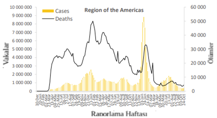 Amerika Bölgesi, önceki haftaya göre %5 artışla 388.000'den fazla yeni vaka bildirmiştir. Verilerin mevcut olduğu 56 ülkeden altısı (%11) yeni vaka sayısında %20 veya daha fazla artış bildirmiş olup en büyük oransal artışlardan bazıları Guatemala (4.155 yeni vakaya karşı 2.998; +%39) , Panama (805'e karşı 603 yeni vaka; +%34) ve Peru’da (2.317'ye karşı 1898 yeni vaka; +%22) görülmüştür. En çok yeni vaka rapor eden ülkeler sırasıyla Amerika Birleşik Devletleri (259.066 yeni vaka; 100.000'de 78.3 yeni vaka; +%1), Şili (41.905 yeni vaka; 100.000'de 219.2 yeni vaka; +%21) ve Brezilya (41 585 yeni vaka; 100.000'de 19.6 yeni vaka; +%22) olmuştur.