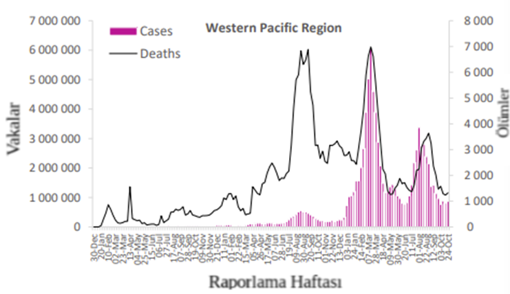 Batı Pasifik Bölgesi, önceki haftaya göre %5'lik bir artışla 871.000'den fazla yeni vaka bildirmiştir. Beş (%15) ülke yeni vakalarda %20 veya daha fazla artış bildirmiş olup en büyük oransal artışlardan bazıları Yeni Zelanda (21 342'ye karşı 14.489 yeni vaka; +%47) ve Moğolistan’da (492'ye 343 yeni vaka ; +%43) gözlenmiştir. En çok yeni vaka bildiren ülkeler sırasıyla Japonya (281 974 yeni vaka; 100.000'de 222,9 yeni vaka; +%21), Çin (257 994 yeni vaka; 100 000'de 17,5 yeni vaka; -%10) ve Güney Kore (241 465 yeni vaka; 100.000'de 471.0 yeni vaka; +%37 artış) olmuştur.