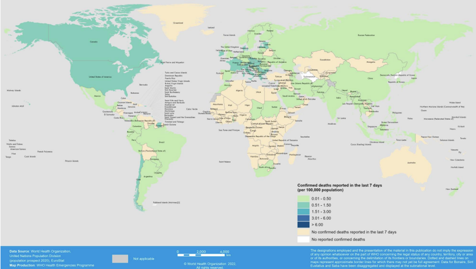 Şekil 3. 24-30 Ekim 2022 tarihleri arasında ülkelere ve bölgelere göre, son yedi günde 100.000 nüfus başına bildirilen COVID-19 ölüm vakaları*