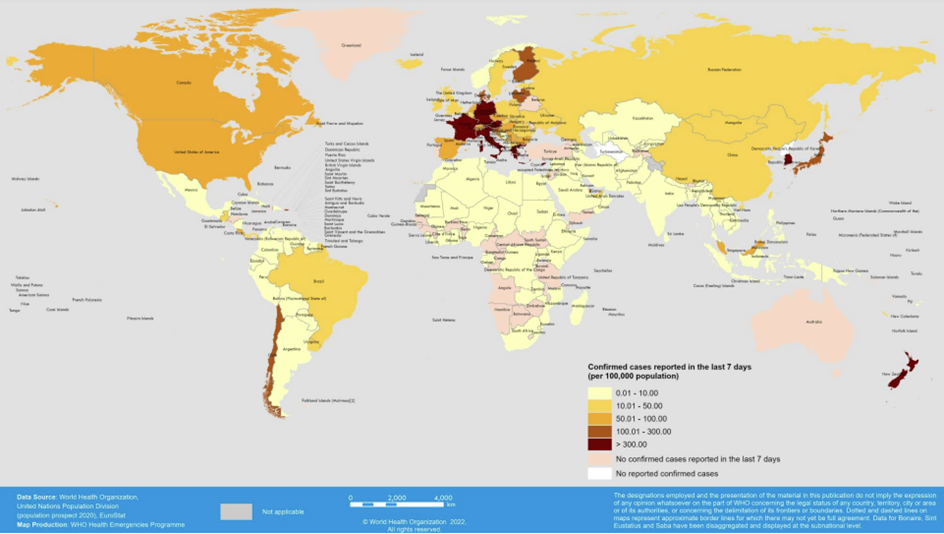 Küresel olarak, 24-30 Ekim 2022 tarihleri arasında bir önceki haftaya göre haftalık yeni vaka sayısı %17 azalmış olup 2,3 milyondan fazla yeni vaka bildirilmiştir. Gerçek vaka sayısının, küresel olarak testlerdeki düşüş nedeniyle hafife alınması muhtemeldir.
