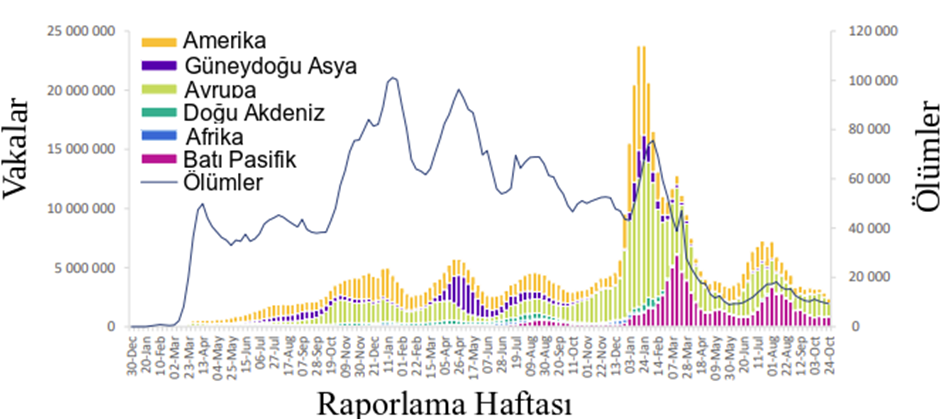 Şekil 1: 30 Ekim 2022 itibariyle DSÖ bölgeleri tarafından haftalık olarak bildirilen COVID-19 vakalarının sayısı **
