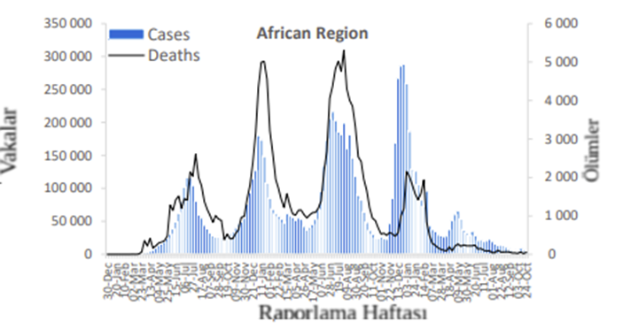 Afrika Bölgesi, bir önceki haftaya göre %39 düşüşle 3800'ün üzerinde yeni vaka bildirmiştir. Verilerin mevcut olduğu 50 ülkeden yedisi (%14), yeni vaka sayısında %20 veya daha fazla artış bildirmiş olup en büyük oransal artışlardan bazıları Madagaskar (40'a 19 yeni vaka; +%111) , Mali (16 yeni vakaya karşı 9; +%78) ve Mozambik’te (44 vs 30 yeni vaka; +%47) görülmüştür. En çok yeni vaka rapor eden ülkeler sırasıyla Güney Afrika (2369 yeni vaka; 100.000 nüfus başına 4.0 yeni vaka; +%17), Kenya (329 yeni vaka; 100.000 başına <1 yeni vaka; +%85) ve Gana (134 yeni vaka; 100.000'de <1 yeni vaka; -%12) olmuştur.