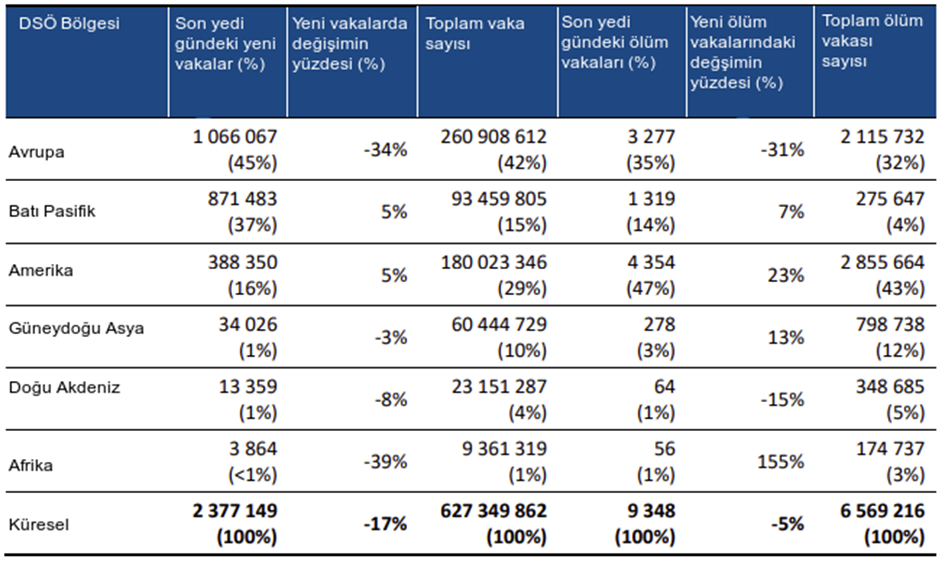 Küresel olarak, 24-30 Ekim 2022 tarihleri arasında bir önceki haftaya göre haftalık yeni vaka sayısı %17 azalmış olup 2,3 milyondan fazla yeni vaka bildirilmiştir (Şekil 1, Tablo 1). Gerçek vaka sayısının, küresel olarak testlerdeki düşüş nedeniyle hafife alınması muhtemeldir. Yeni haftalık ölüm vakası sayıları, 9.300'den fazla ölümle birlikte bir önceki haftaya göre %5 azalmıştır. 30 Ekim 2022 itibariyle, dünya çapında 627 milyondan fazla teyit edilmiş vaka ve 6,5 milyondan fazla ölüm rapor edilmiştir.