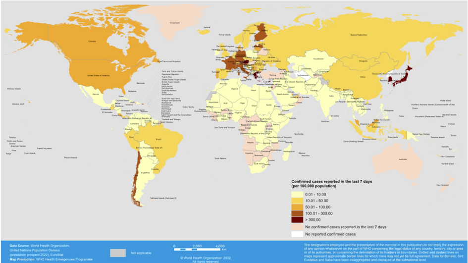 Ülke düzeyinde, en yüksek haftalık yeni vaka sayıları Japonya (401.693 yeni vaka; +%42), Güney Kore (299 440 yeni vaka; +%24), Amerika Birleşik Devletleri (266.104 yeni vaka; +%5), Almanya (224 099 yeni vaka; -%40) ve Çin’den (219 102 yeni vaka; -%15) bildirilmiştir. Haftalık yeni ölümlerin en yüksek rakamları Amerika Birleşik Devletleri (2480 yeni ölüm; -%20), Hindistan (1484 yeni ölüm; esas olarak toplu raporlama nedeniyle +%2598), Çin (539 yeni ölüm; +%10), Rusya Federasyonu (484 yeni ölüm; -%15) ve Fransa’dan (404 yeni ölüm; -%20) rapor edilmiştir.