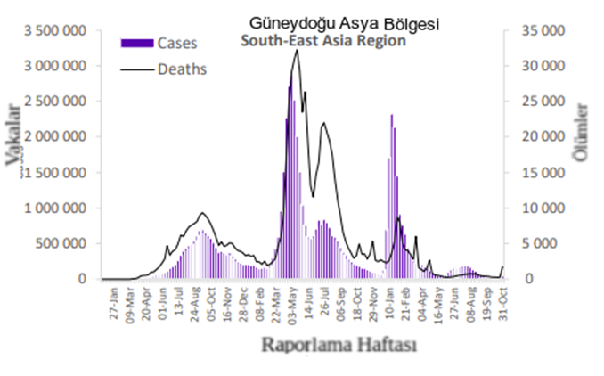 Güneydoğu Asya Bölgesi, bir önceki haftaya göre %28 artışla 43.000'den fazla yeni vaka bildirmiştir. Verilerin mevcut olduğu 10 ülkeden dördü (%40) yeni vakalarda %20 veya daha fazla artış bildirmiş olup en yüksek orantılı artışlar Sri Lanka gözlendi (258'e karşı 76 yeni vaka; +%239), Doğu Timor ( dört yeni vakaya karşı iki yeni vaka; +%100) ve Nepal’de (184'e karşı 95 yeni vaka; +%94) gözlemiştir. En yüksek sayıda yeni vaka Endonezya (30 670 yeni vaka; 100.000'de 11.2 yeni vaka; +%56), Hindistan (8313 yeni vaka; 100.000'de <1 yeni vaka; -%13) ve Tayland'dan (2.759 yeni vaka; 100.000 +%8 başına 4.0 yeni vaka) rapor edilmiştir.