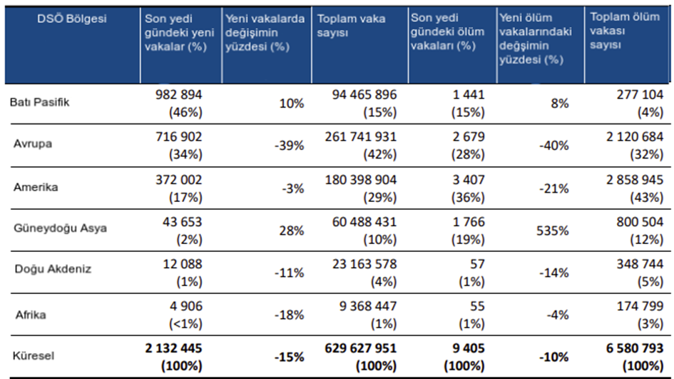 Bölgesel düzeyde, yeni bildirilen haftalık vaka sayısı altı DSÖ bölgesinin dördünde azalmış veya sabit kalmıştır: Güney-Doğu Asya Bölgesi'nde (+28%) ve Batı Pasifik Bölgesi'nde (+10%) vaka sayıları artarken Avrupa Bölgesi (%-39), Afrika Bölgesi (%-18), Doğu Akdeniz Bölgesi (%-11). ) ve Amerika Bölgesi’nde (-3%) vaka sayıları azalmıştır. Haftalık yeni ölüm vakalarının sayısı dört bölgede azalmış veya sabit kalmıştır: Güney-Doğu Asya Bölgesi'nde (+%535: esas olarak Hindistan'dan gelen toplu raporlama nedeniyle) ve Batı Pasifik Bölgesi'nde (+%8) ölüm sayısı artarken Avrupa Bölgesi (%-40), Amerika Bölgesi (%-21), Doğu Akdeniz Bölgesi (%-14) ve Afrika Bölgesi’nde (-4 %) azalmıştır.