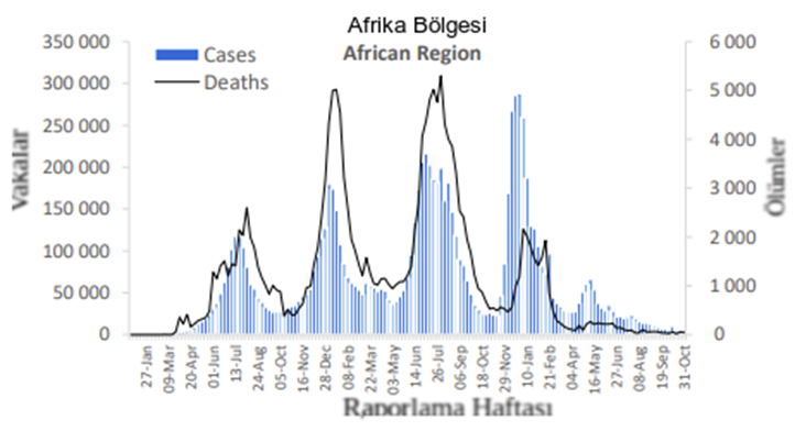 Afrika Bölgesi, önceki haftaya göre %18'lik bir düşüşle 4.900'den fazla yeni vaka bildirmiştir. Verilerin mevcut olduğu 50 ülkeden sekizi (%16), yeni vakalarda %20 veya daha fazla artış bildirmiş olup en yüksek orantılı artışlar Burundi (47'ye 18 yeni vaka; +%161), Demokratik Kongo Cumhuriyeti (133'e karşı 59 yeni vaka; +%125) ve Eswatini’de (60'a karşı 32 yeni vaka; +%88) gözlenmiştir. En yüksek sayıda yeni vaka Güney Afrika (1993 yeni vaka; 100.000'de 3.4 yeni vaka; -%16), Kenya (593 yeni vaka; 100.000'de 1,1 yeni vaka; +%80) ve Güney Sudan’dan (545 yeni vaka; 100.000'de 4,9 yeni vaka; önceki hafta hiç vaka bildirilmedi) bildirilmiştir.