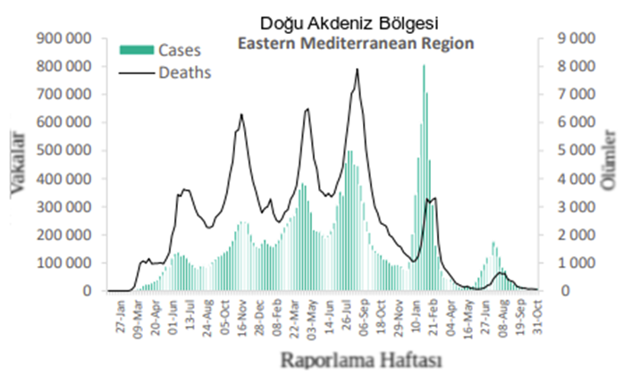 Bölgede haftalık yeni ölüm vakalarının sayısı bir önceki haftaya göre %14 azalırken, 57 yeni ölüm vakası bildirilmiştir. En yüksek sayıda yeni ölüm vakaları, İran (21 yeni ölüm; 100.000'de <1 yeni ölüm; -%25), Suudi Arabistan (12 yeni ölüm; 100.000'de <1 yeni ölüm; -%8) bildirilmiştir. ) ve Lübnan’dan (sekiz yeni ölüm; 100.000'de <1 yeni ölüm; +%33) bildirilmiştir.