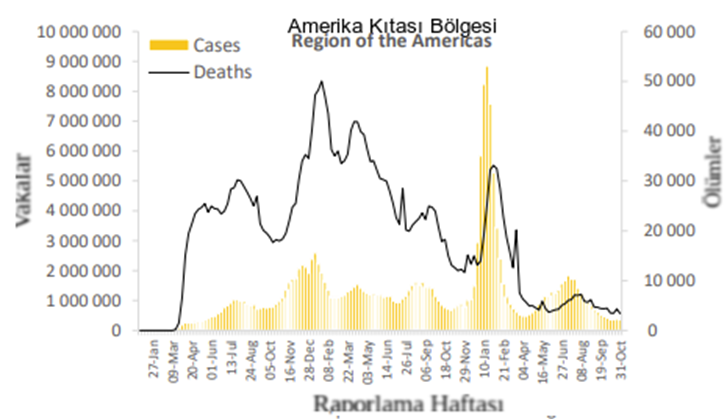 Amerika Bölgesi, bir önceki haftaya göre %3'lük bir düşüşle 372 000'den fazla yeni vaka bildirmiştir. Verilerinin mevcut olduğu 56 ülkeden altısı (%11), yeni vakalarda %20 veya daha fazla artış bildirmiş olup en yüksek orantılı artışlar Saint Lucia (15'e üç yeni vakaya; +%400), Peru (5615’e 2317 yeni vaka; +%142) ve Ekvador (910'a karşılık 482 yeni vaka; +89%) gözlenmiştir. En yüksek sayıda yeni vaka Amerika Birleşik Devletleri (266 104 yeni vaka; 100.000'de 80.4 yeni vaka; +%5), Şili (35.423 yeni vaka; 100.000'de 185.3 yeni vaka; -%15) ve Brezilya’dan (26 836 yeni vaka; 100.000'de 12.6 yeni vaka; -%35) bildirilmiştir.